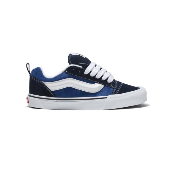 Las zapatillas Vans Knu Skool color azul celeste retoman la estética exagerada de los años 90 con una silueta de perfil bajo completamente confeccionada en suede. Este modelo presenta una lengüeta hinchada, cuello acolchado y el clásico Sidestripe™ reformulado en un llamativo diseño 3D de diamante, resaltando su inspiración en la Old Skool original. Incorporan tiradores en el talón para facilitar el calce y la clásica suela de goma con diseño waffle que refuerza su identidad "Off The Wall". Una propuesta audaz que celebra el volumen y el estilo nostálgico con carácter contemporáneo.